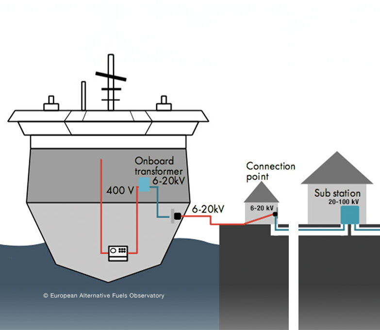 Onshore Power Supply is any technology which enables terminal operators to supply shore-based electricity to incoming vessels when mooring at berths thus their main and auxiliary engines can be shut down - it is also known as "Cold Ironing" in naval terminology, Alternative Marine Power (AMP) or Shoreside Electricity (SSE).